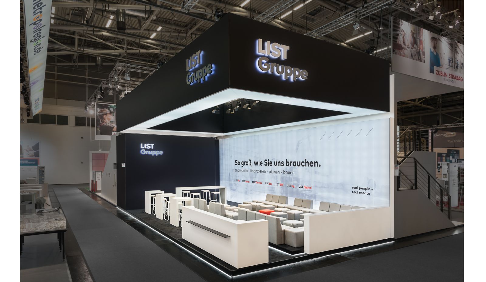 Auf Wunsch planen und produzieren wir Messestände gemäß Brandschutzklasse B1 nach DIN 4102-1 bzw. EN13501-1. Unser Service umfasst außerdem die weltweite Logistik-Koordination, die Vor-Ort-Montage mit erfahrenen Teams und die Einlagerung von Messeständen. Und damit Sie in allen Phasen jederzeit den Überblick behalten, weisen wir Ihnen einen persönlichen Ansprechpartner zu, der Sie während des gesamten Projekts begleitet.